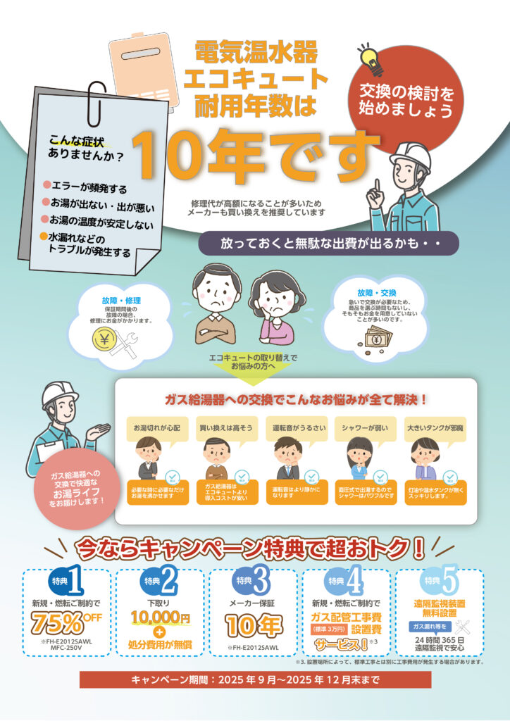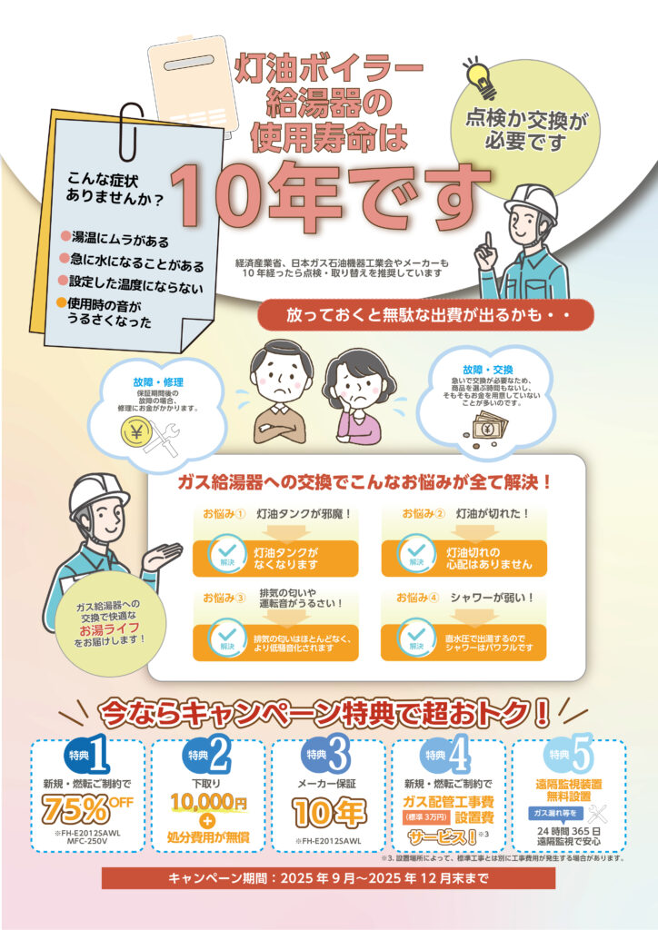10年経つと点検・交換が必要になってくる為、この機会に1度ご自宅の給湯器を確認してみましょう!